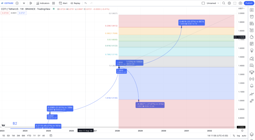 Als COTI hetzelfde pad volgt, zou de maximale koers volgens de COTI koers verwachting 2030 rond $1,8450 kunnen liggen. De verwachte lows zouden rond $1,50 kunnen liggen. Dit geeft aan dat COTI tegen die tijd de opwaartse lange-termijn trend zou hebben bevestigd.