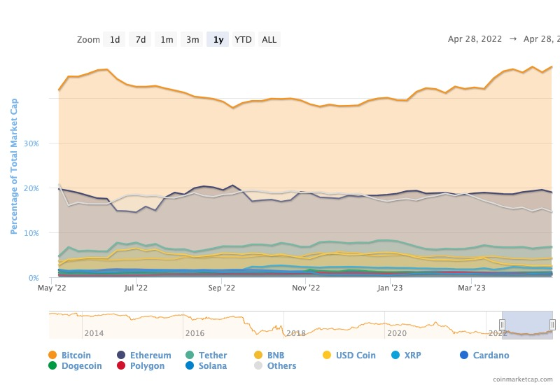 Bovendien kun je alleen al door te kijken naar de Bitcoin-dominantie grafiek, de dynamische aard van de cryptomarkt zien.