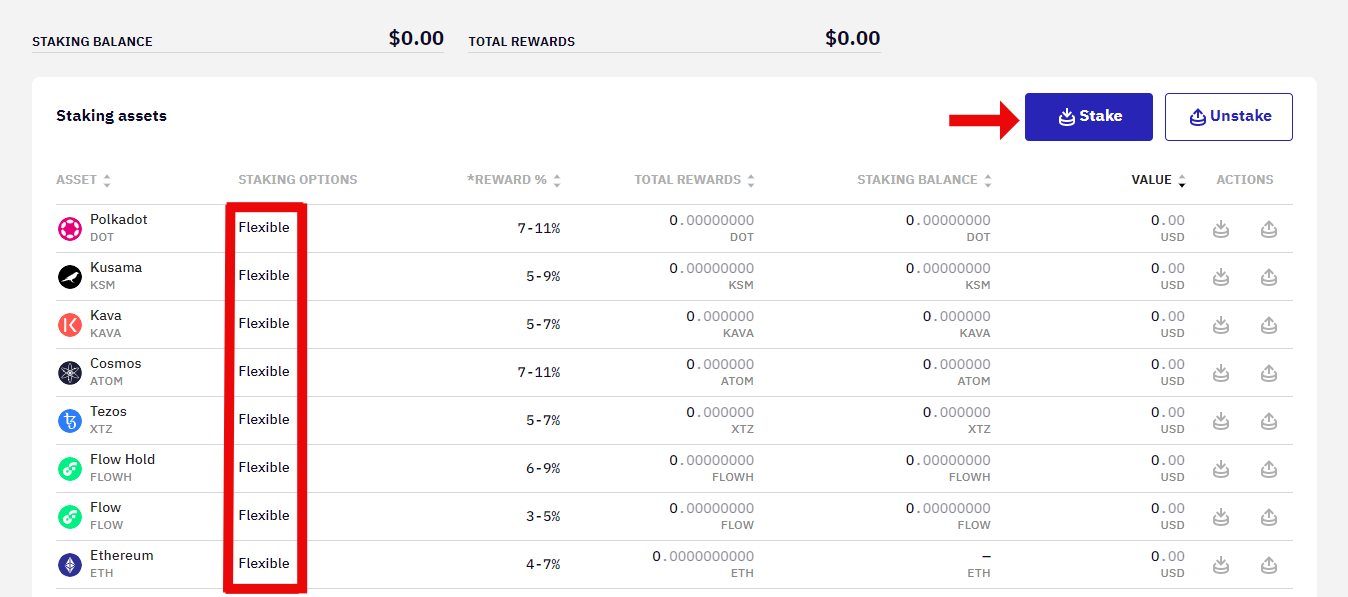 De meeste crypto’s kun je staken voor een bepaalde periode van 30, 60, 90 of zelfs 120 dagen. Sommige crypto’s kunnen gestaked worden met een flexibele termijn, wat betekent dat je ze op elk moment kunt unstakes en nog steeds de beloningen kunt ontvangen.