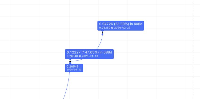 Om het voorwaartse pad voor DigiByte uit te breiden, kunnen we de Fib-indicator gebruiken op de laatste high van 2025 van $0,205.