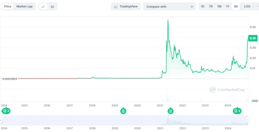 Dogecoin steeg van fracties van een cent naar een indrukwekkende piek van $0,7376 in mei 2021.