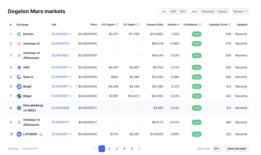 Ondanks het feit dat het een memecoin is, heeft Dogelon een diverse aanwezigheid op exchanges. Hier zijn de top gecentraliseerde en gedecentraliseerde exchanges waar je Dogelon pairs kunt verhandelen.