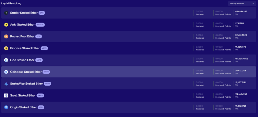 - Restaking LSD’s: Dit zijn de ontvangst tokens die liquid staking oplossingen zoals Lido, Rocketpool en meer bieden. EigenLayer accepteert hetzelfde.