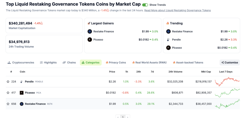 Exchange en info aggregators zoals CoinGecko hebben nu een specifieke categorie genaamd restaking tokens. Dit laat zien hoe cruciaal de economische implicaties kunnen zijn als deze use case nog belangrijker wordt.