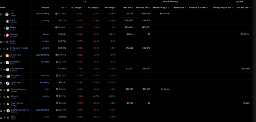 DeFi aanwezigheid van EigenLayer, het meest invloedrijke restaking protocol, staat op plaats 11 en heeft de afgelopen 30 dagen een TVL stijging van bijna 75% gezien. Op 29 januari 2024 staat er op EigenLayer voor $1,93 miljard aan fondsen vast.