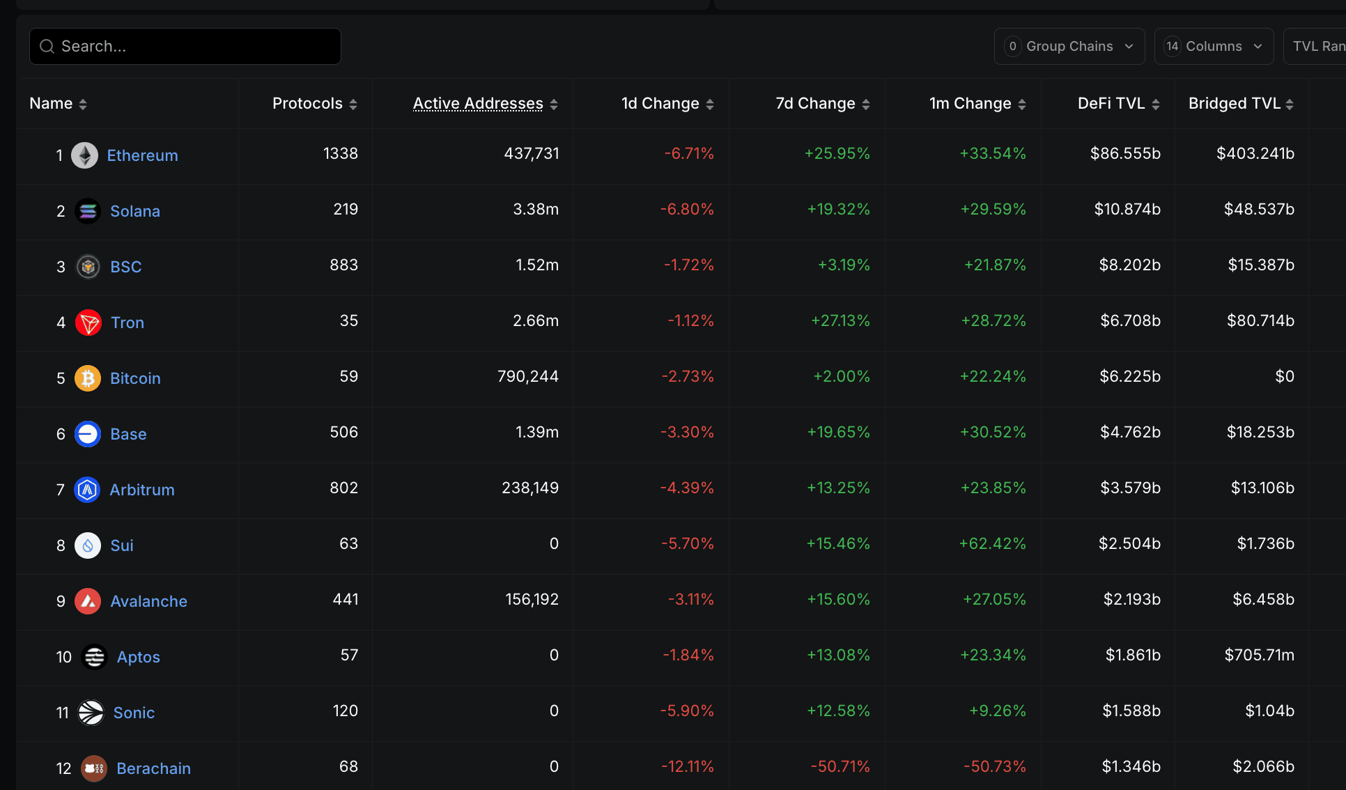 Hoge-snelheids chains zoals Solana (850K DAUs) en Sui (350K DAUs) blijven ontwikkelaars en gebruikers aantrekken door lage kosten en bijna directe finaliteit te bieden. Ethereum L1, daarentegen, heeft ongeveer 400.000 DAUs met hogere latentie en kosten.