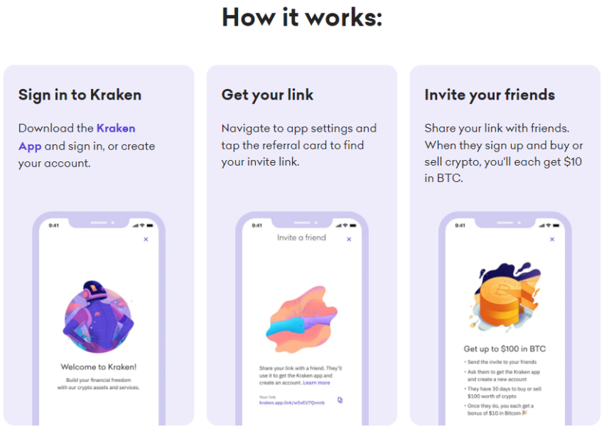 Wanneer u de Kraken app downloadt en een vriend doorverwijst, heeft u de mogelijkheid om BTC te verdienen. De manier waarop het doorverwijzingsprogramma van Kraken werkt, is door naar de app te gaan en uw unieke doorverwijslink op te halen.
