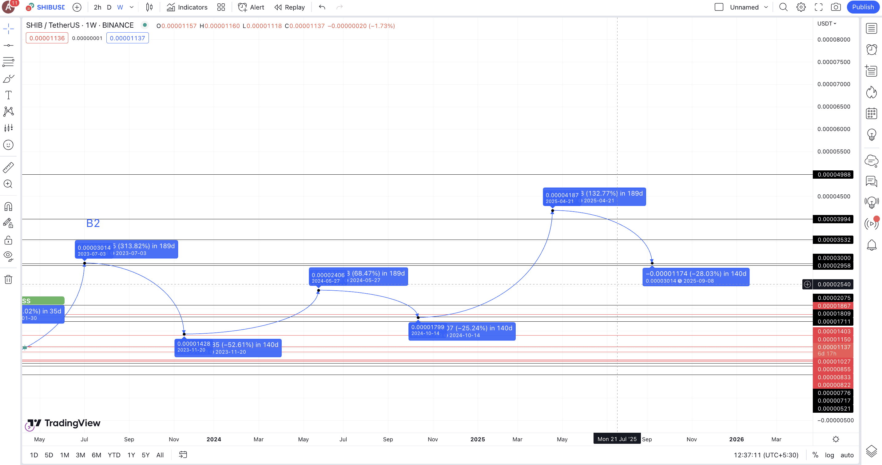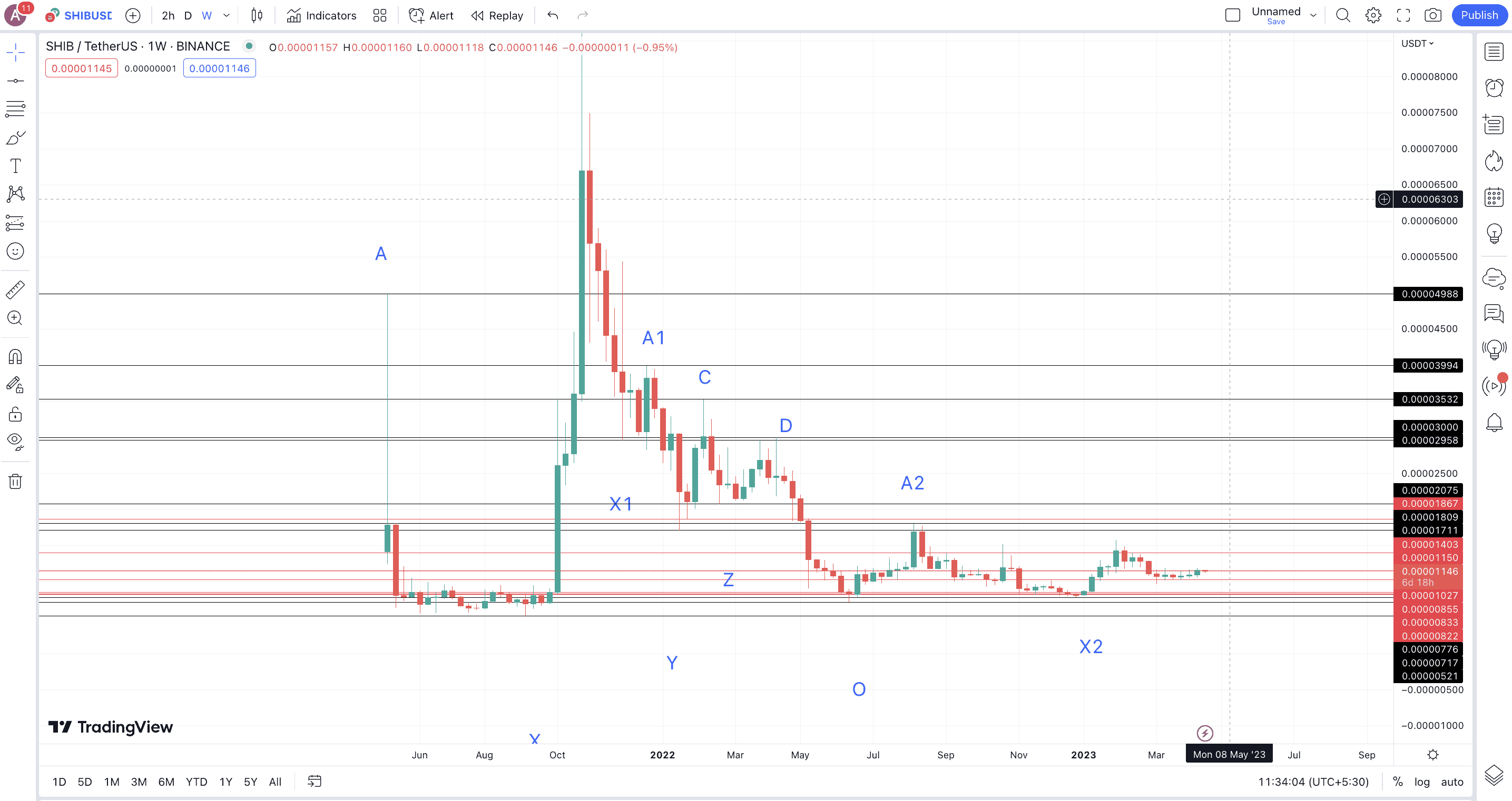 Vanaf de low maakt SHIB weer een high en als het vorige patroon zich herhaalt, zien we misschien binnenkort weer een high boven de vorige high. Laten we nu alle punten markeren.