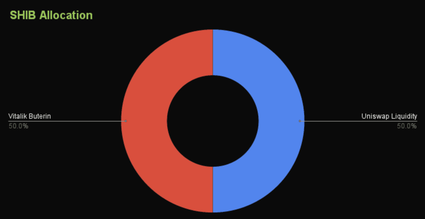 Shiba Inu heeft een opvallend tokenomics-model, dat begon met een initiële totale aanbodlimiet van 1 quadriljoen tokens. Bij de toewijzing werd 50% van de totale voorraad gestuurd naar Ethereum-oprichter Vitalik Buterin, terwijl de overige helft werd opgesloten in de UniSwap-liquiditeit.