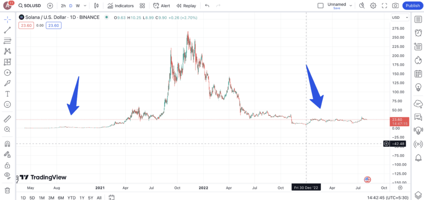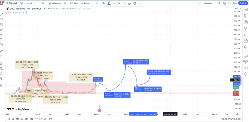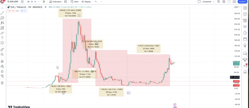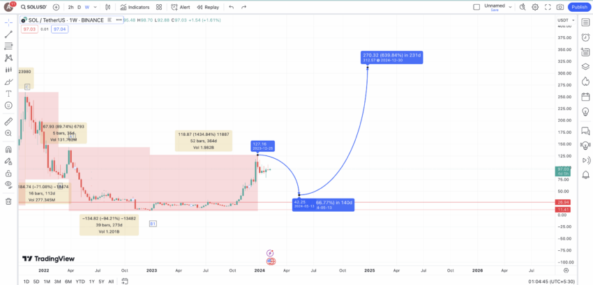 Aangezien de SOL koers bijna $260 bereikte, kunnen we een dip van 66,90% verwachten, de kleinste procentuele daling uit de bovenstaande tabel.