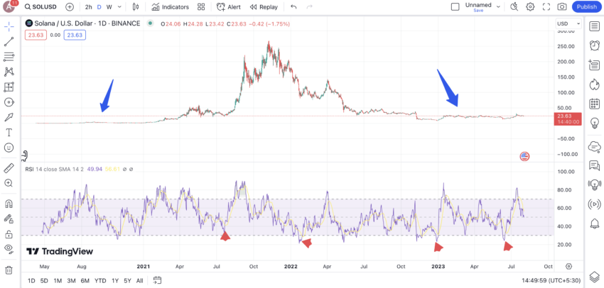 Als we de corresponderende RSI-patronen bekijken, zien we dat de correctie in elke fase stopte en de koers steeg wanneer de RSI diep in het oversold-gebied daalde (onder 30). De rode pijlen markeren deze punten. Om de SOL koers vanaf hier te laten stijgen, moeten we zien dat de RSI terugkeert naar de oversold-zone.
