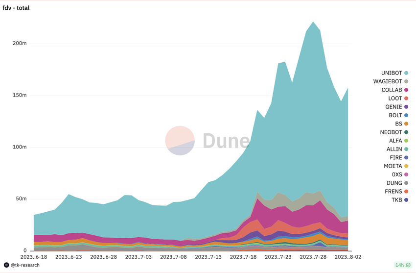 In tegenstelling tot meme coins hebben Telegram Bot Coins beter dan gemiddeld gepresteerd dan de wereldwijde markt, wat wijst op een potentiële stijgende trend. Het dagelijkse volume steeg van $10,4 miljoen naar $15,1 miljoen tussen 19 juli 2023 en 20 juli 2023, volgens data van Dune Analytics. Bovendien is vanaf 5 augustus 2023 de totale marktwaarde van Telegram bot coins gestegen naar $192 miljoen.