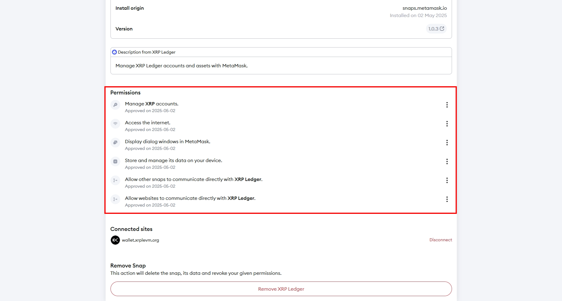 Je kunt de Snaps die je hebt goedgekeurd direct binnen de MetaMask-interface bekijken en beheren. Als je naar de instellingen van de snap in je MetaMask-wallet gaat, kun je ook zien welke toestemmingen je hebt goedgekeurd.