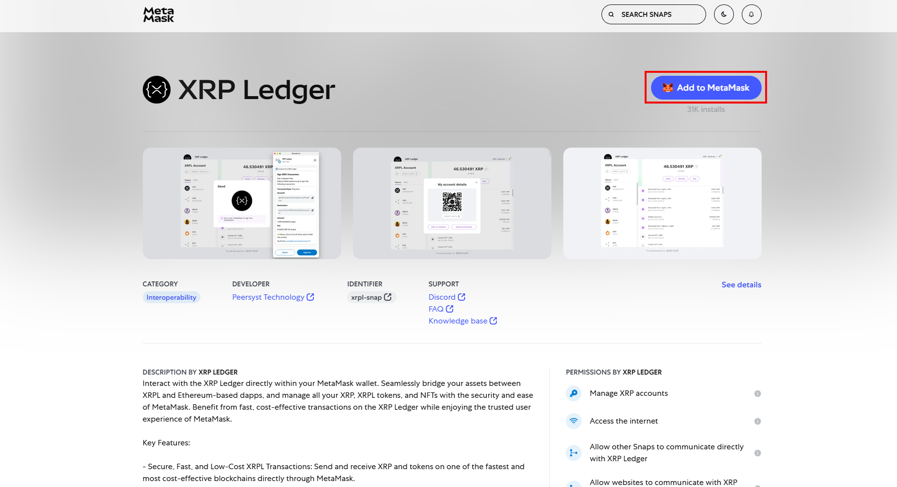 3. Navigeer naar MetaMask Snaps: Nadat je MetaMask hebt geïnstalleerd, ga je naar MetaMask Snaps om XRP Ledger in te schakelen. Selecteer de knop toevoegen aan MetaMask.