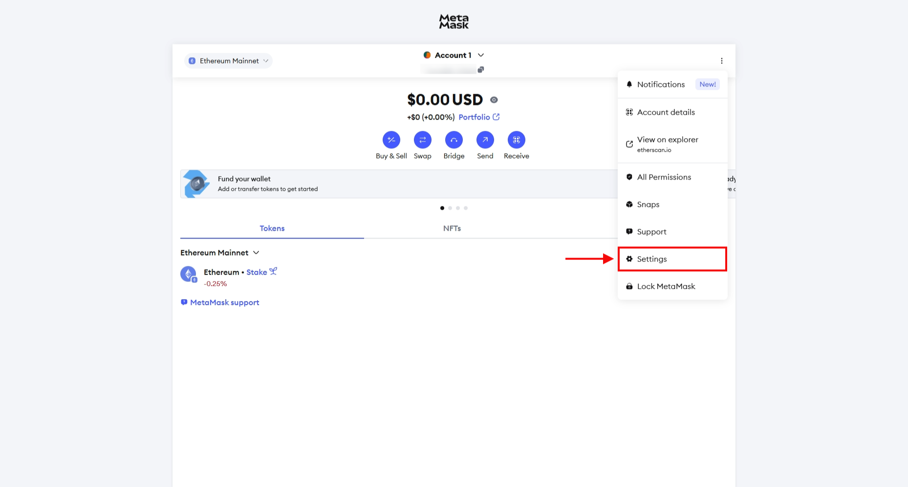 1. Ga naar instellingen: Open je wallet en selecteer het kleine menu met drie stippen in je MetaMask-account, ga naar beneden naar Instellingen.