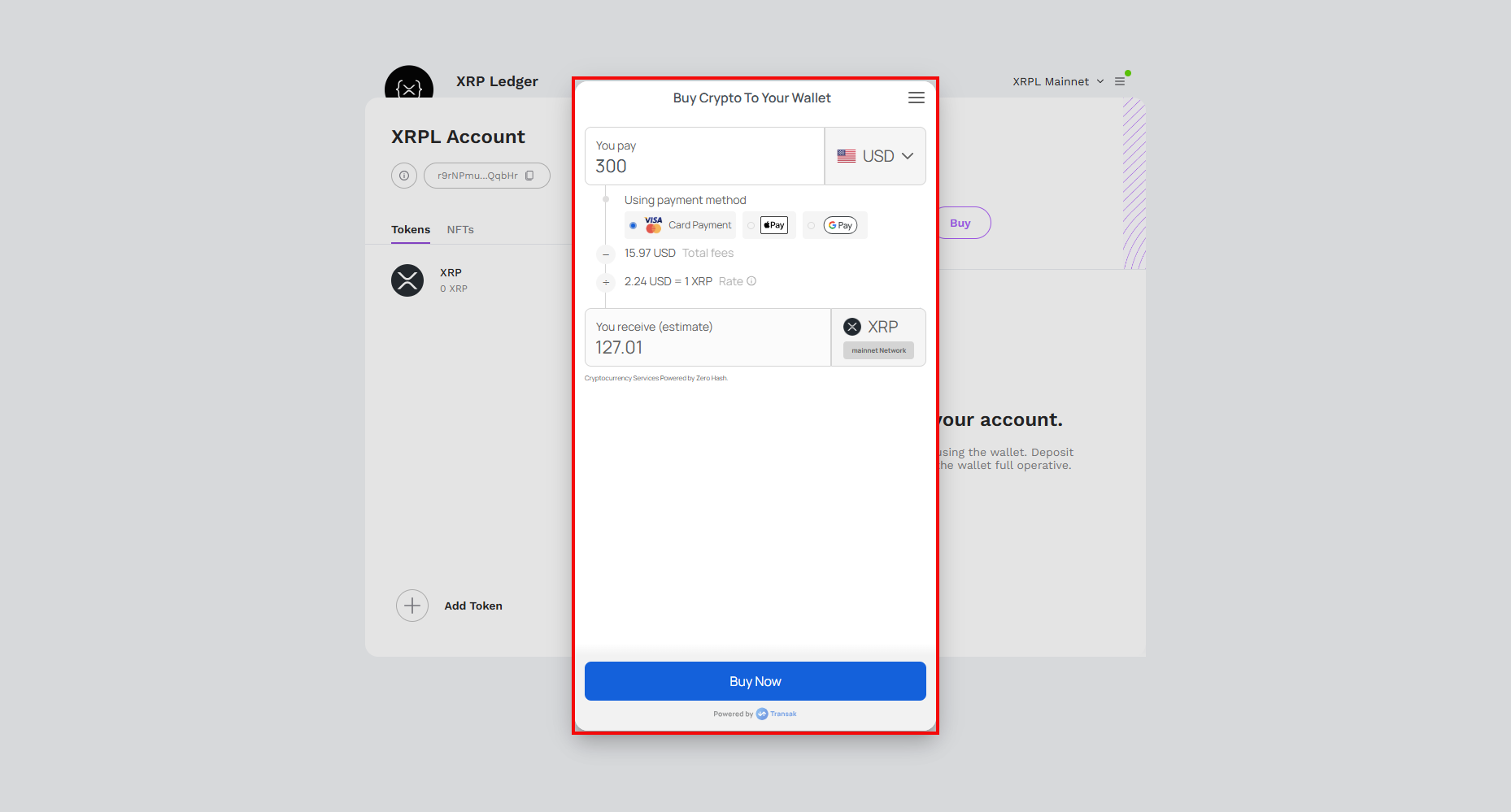 Als je XRP moet kopen om je account te activeren, kun je dit direct binnen de snap doen. XRPL Snap gebruikt Transak, een fiat-naar-crypto betalingsgateway, om gebruikers te helpen instappen.