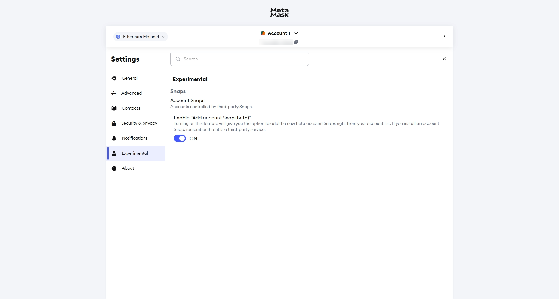 2. Schakel snaps in: Selecteer het kleine menu met drie stippen in je MetaMask-account, ga naar beneden naar Instellingen, druk op Experimenteel en schakel snaps in.