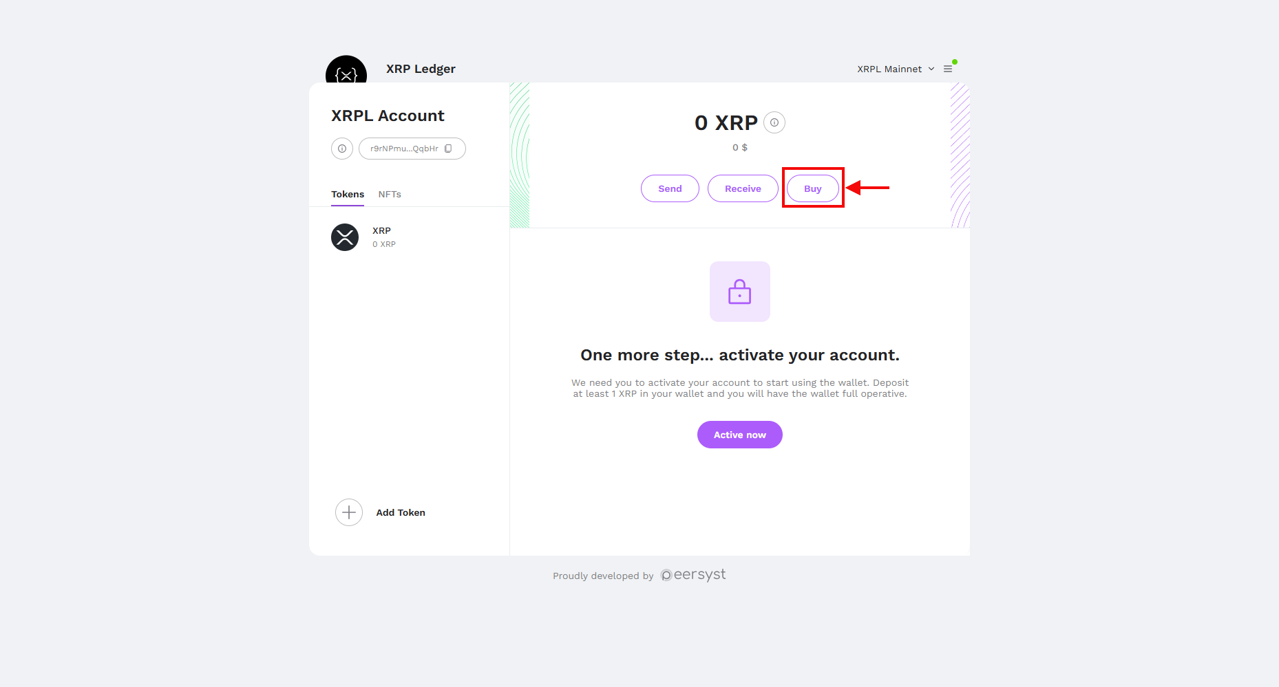 1. Voorzie je account van XRP: Zodra je XRPL-account is ingesteld op MetaMask, moet je je account activeren. Selecteer de Koop-knop om XRP te kopen via MetaMask.