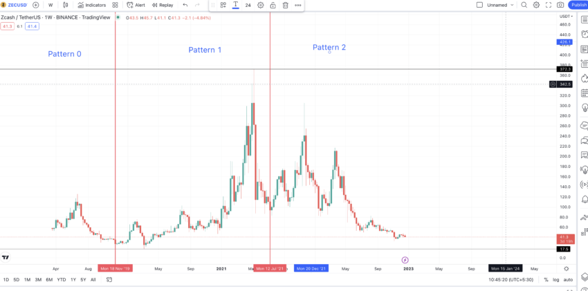 Als we kijken naar de grafiek voor ZEC, wordt een patroon duidelijk. We zullen hier kort op terugkomen.