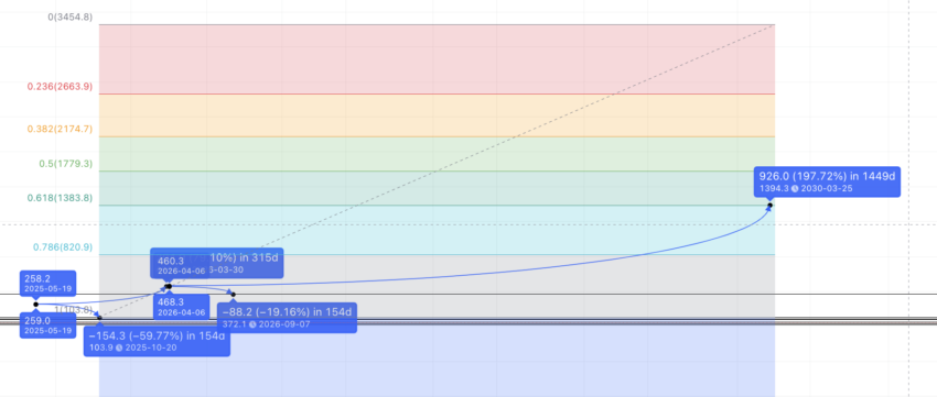 Als de ZEC koers verwachtingen tot 2025 aanhouden, kunnen we de 79,23% high en een maximale tijd van 315 dagen gebruiken om de Zcash prijs verwachtingen voor 2026 te krijgen.