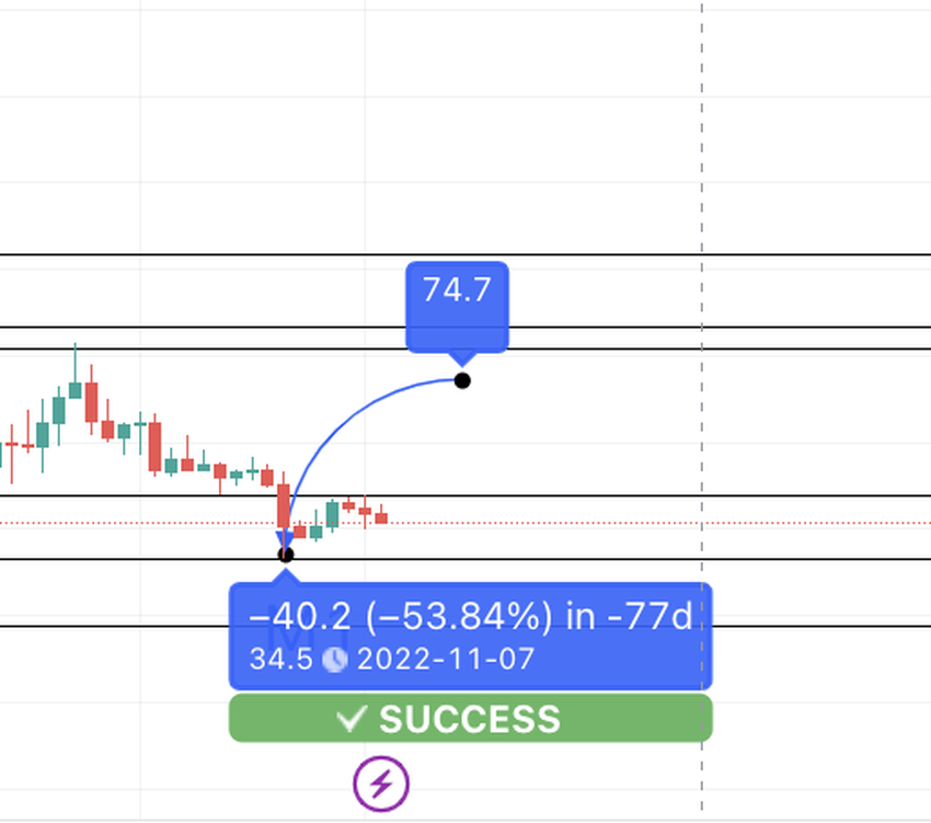 Als we M1 als de huidige low beschouwen, zou de volgende high eind januari 2023 op $74,70 moeten liggen.