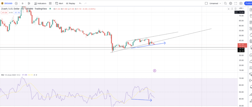 ZEC wordt momenteel verhandeld op $41,10. We kunnen een onmiddellijke correctie verwachten als het verder corrigeert en onder $38,09 daalt. De RSI laat een bearish divergentie-patroon zien, waarbij de koers higher highs maakt en de RSI lower lows vormt.