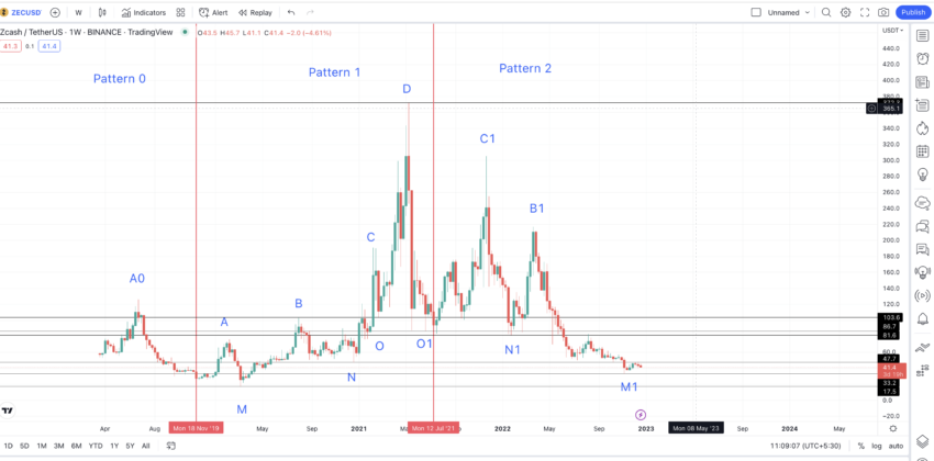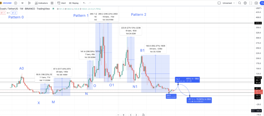 Daarom zou het enige tijd kunnen duren voordat de high van $74,70 wordt gevormd. De verwachting zal ook moeten worden bijgesteld als de vorige low van M1 op $33,5 wordt doorbroken en ZEC een nieuwe low maakt. Met name de zwakke marktomstandigheden zorgden ervoor dat ZEC in 2023 slechts tot $34 kon stijgen, waardoor het vorige niveau van $41,10 het hoogste werd.