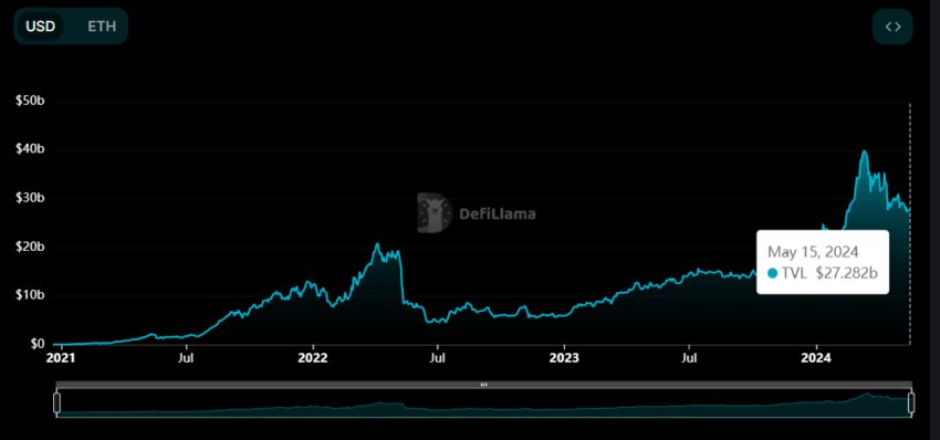 Lido is zo populair gebleken dat het nu het grootste DeFi-protocol van Ethereum is. Volgens de data van DeFiLlama heeft Lido nu een total value locked (TVL) van $27,28 miljard.