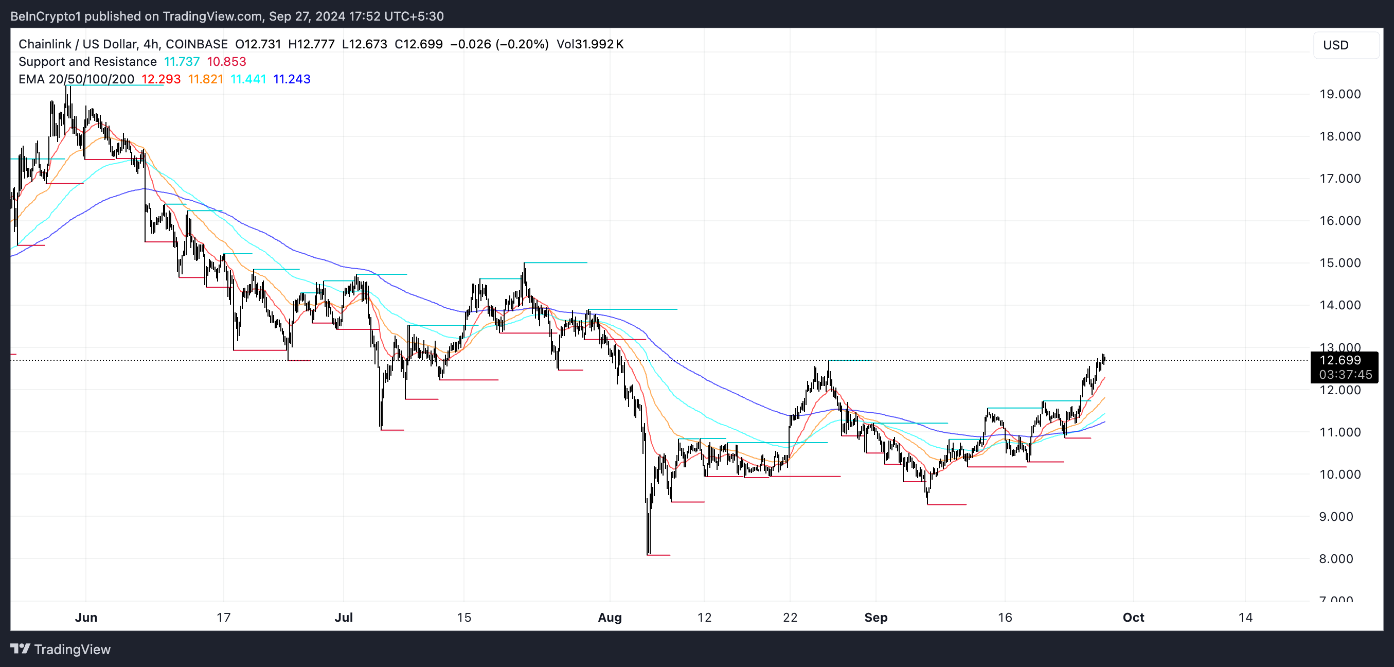 Op 17 september vormden de EMA-lijnen van LINK een gouden kruis, wat een opmerkelijke koersstijging van 20% in de daaropvolgende dagen teweegbracht. Een gouden kruis vindt plaats wanneer een kortetermijn-EMA een langetermijn-EMA kruist, wat doorgaans wijst op een bullish verschuiving in momentum. Handelaren letten vaak op dit patroon als een indicatie van opwaartse koersbeweging.