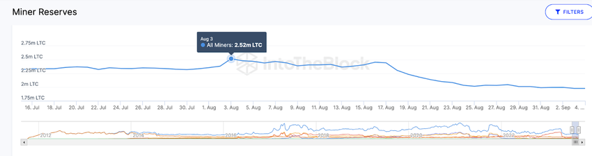 Vanaf 4 september staan de cumulatieve reserves van LTC Miners nu op 1,98 miljoen. Dit vertegenwoordigt een daling van 540.000 LTC in de afgelopen maand.