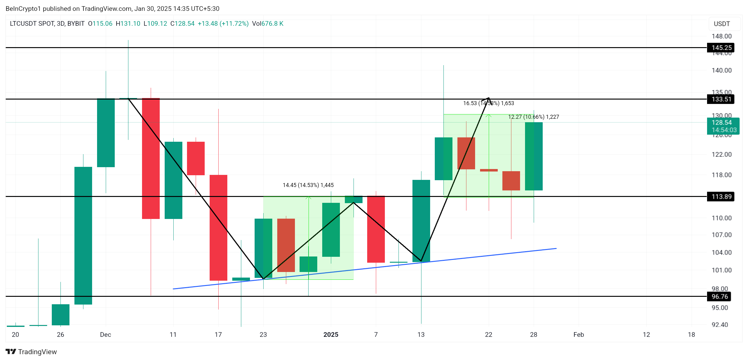 Een beslissende beweging boven $133 zou een bredere uitbraak kunnen veroorzaken, waardoor LTC richting $145 kan stijgen. Het overwinnen van dit niveau zou het huidige bearish-neutrale sentiment ongeldig maken, waardoor de weg wordt vrijgemaakt voor een sterkere herstel. Als het bullish momentum versnelt, zou Litecoin een hoger bereik kunnen vestigen, waardoor het zijn positie als een van de toonaangevende altcoins in de markt versterkt.
