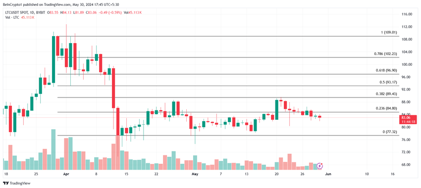Dekoers van Litecoin heeftgeworsteld om boven de $90 te komen, waardoor het 38,2% Fibonacci Retracement steun zou worden. Maar erger nog, LTC daalde onder de 23,6% Fib-lijn.
