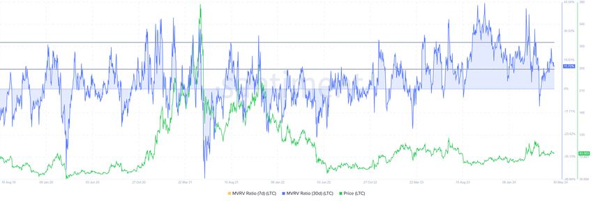 Dit kan worden waargenomen in de verhouding tussen marktwaarde en gerealiseerde waarde (MVRV), die de winst of het verlies van investeerders evalueert. Litecoin’s 30-daagse MVRV staat momenteel op 11%, wat wijst op winst en mogelijk leidt tot verkoop. Historisch gezien vinden LTC-correcties plaats wanneer de MVRV tussen 10% en 24% ligt, wat bekend staat als de gevarenzone.