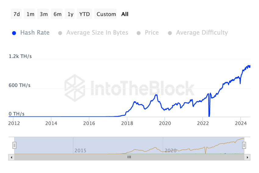 Interessant is dat de daling van Litecoin’s mijnwerkerreserve sinds maart gepaard gaat met een toename van de hashrate van het netwerk. Sterker nog, op het moment van schrijven is de hashrate van het netwerk op een all-time high van 1,07k TH/s.
