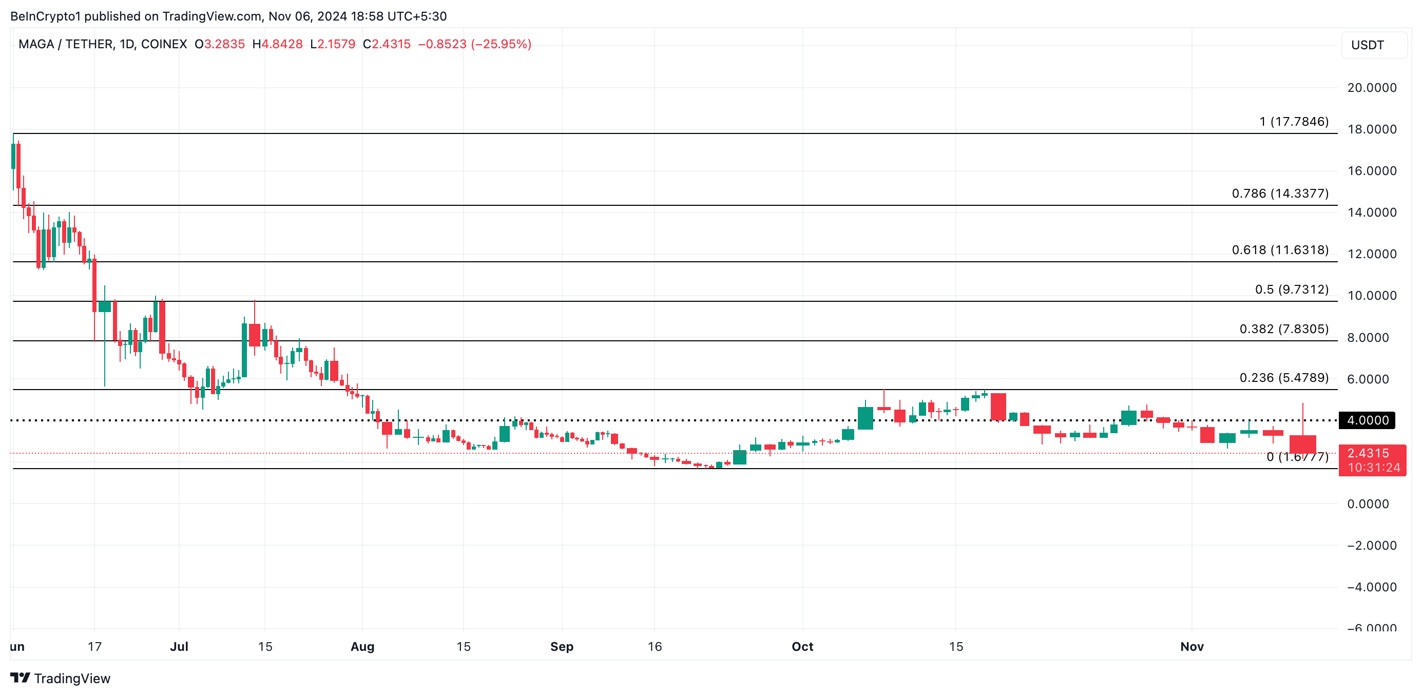 • MAGA Coin koers daalt 35% na Trumps overwinning, indicatoren suggereren mogelijke verdere verliezen.