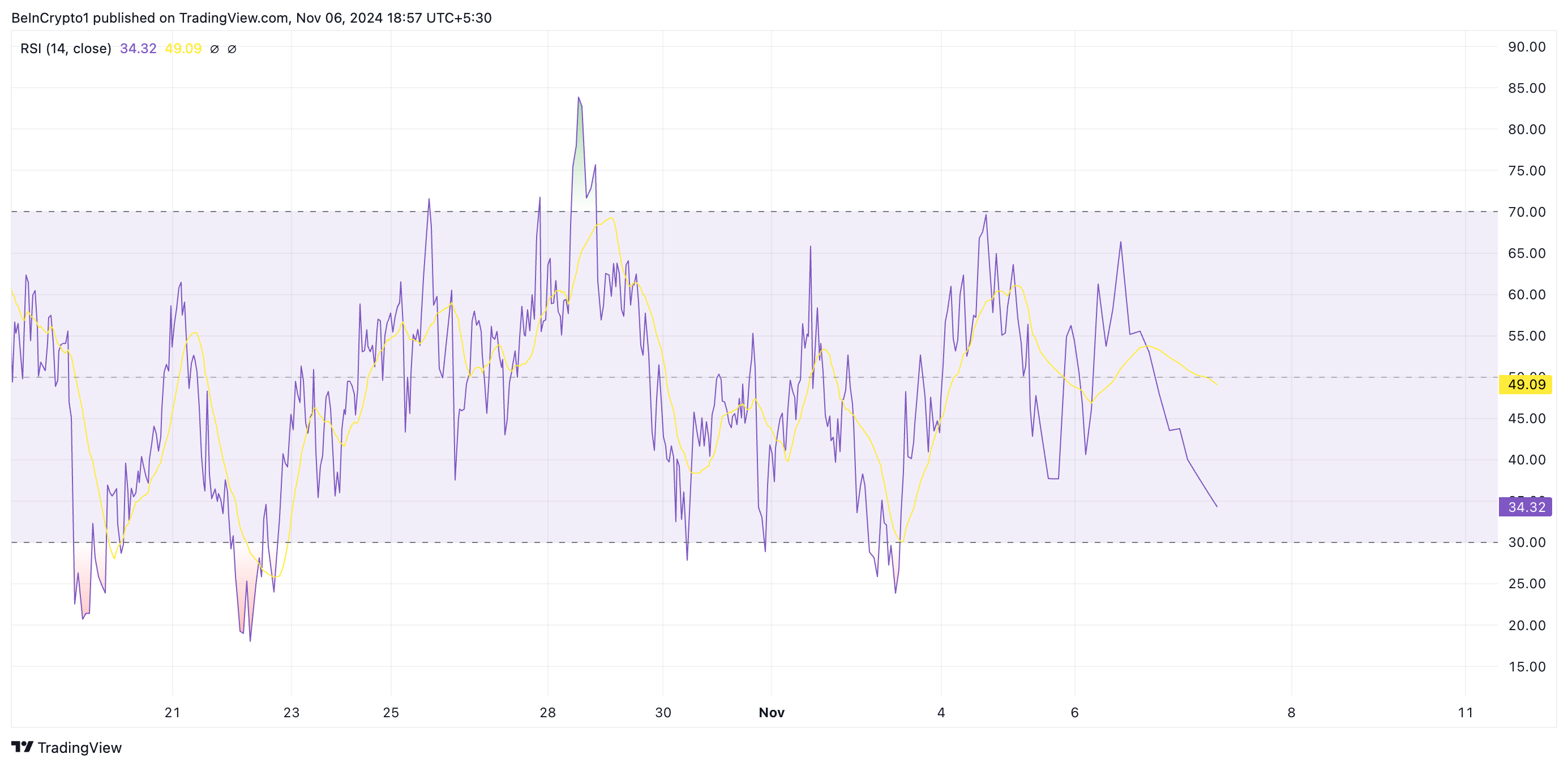 Bovendien is de Relative Strength Index (RSI) van TRUMP in een neerwaartse trend en onder de neutrale lijn van 50, wat de toename van de verkoopdruk in de markt van de meme coin bevestigt. Met een RSI van 34,32, die de overbought en oversold marktomstandigheden meet, geeft aan dat de verkoopactiviteit het koopvolume onder marktdeelnemers overtreft.