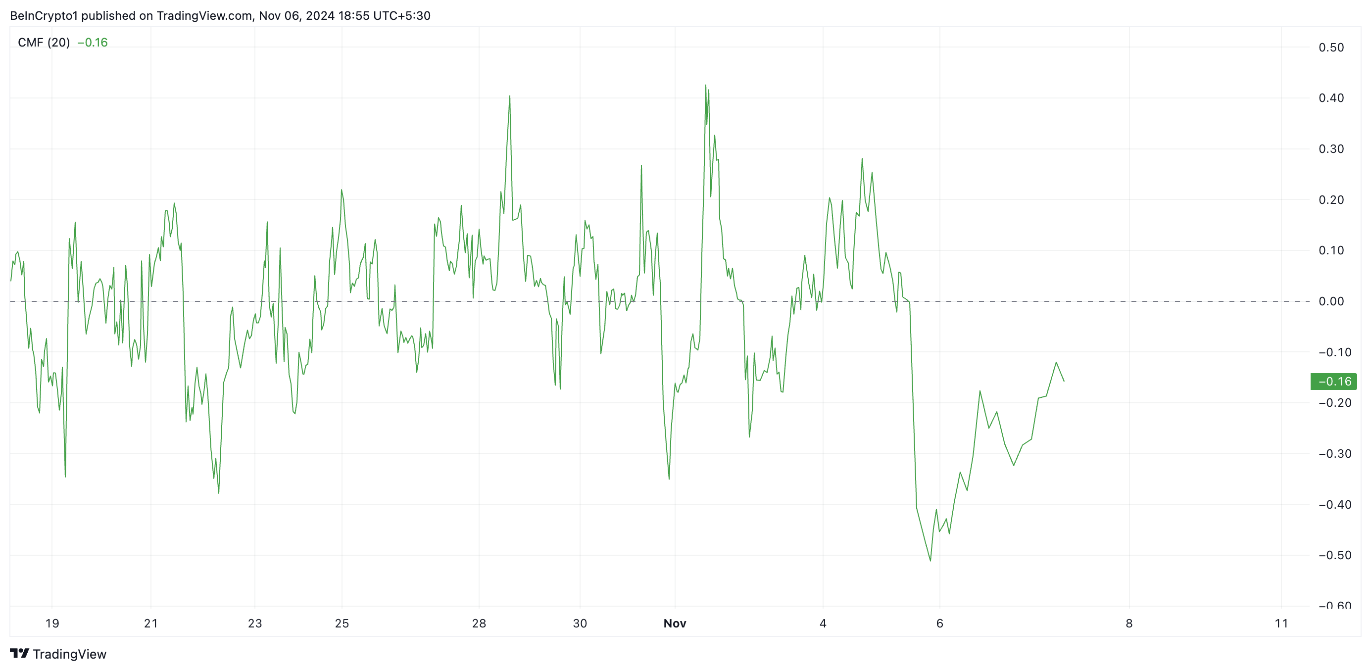 Een beoordeling van de TRUMP/USD-uurgrafiek heeft aanzienlijke uitstromen uit de markt van de meme coin aangetoond. Bijvoorbeeld, zijn Chaikin Money Flow (CMF), die geldstromen naar en uit de markt volgt, is onder nul op -0,16 op dit moment.
