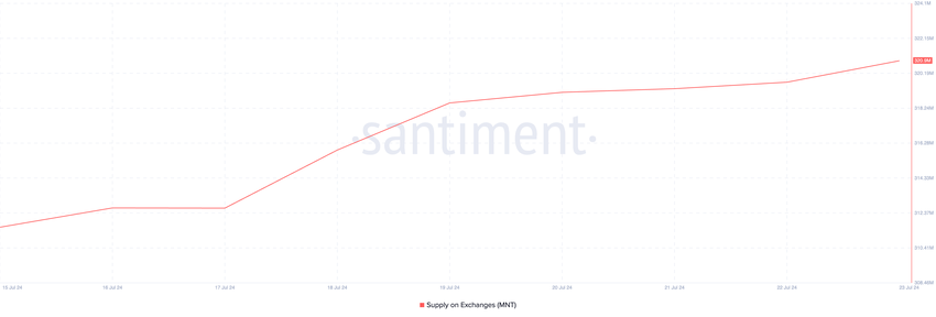 SponsoredVolgens de data van Santiment zijn er 321 miljoen MNT tokens met een waarde van ongeveer $286 miljoen tegen de huidige koers in wallets op exchanges. Het aanbod van de token op exchanges begon een opwaartse trend op 17 juli en is sindsdien met 3% gestegen.