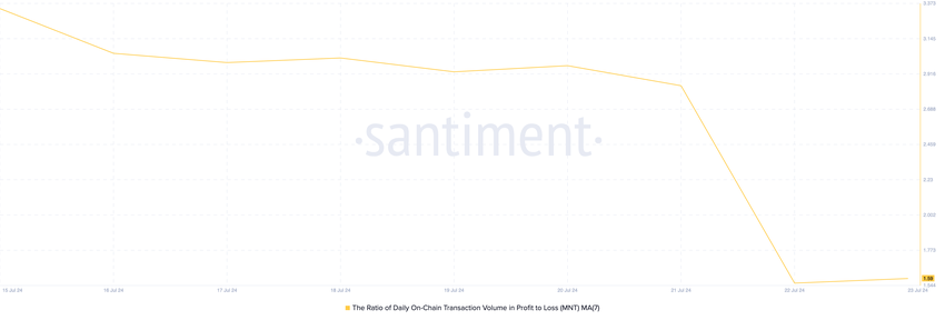 Het zevendaagse voortschrijdende gemiddelde van de dagelijkse verhouding van het on-chain transactievolume in winst ten opzichte van verlies geeft aan dat in de afgelopen week voor elke MNT-transactie die resulteerde in verlies, 1,59 transacties winst opleverden.