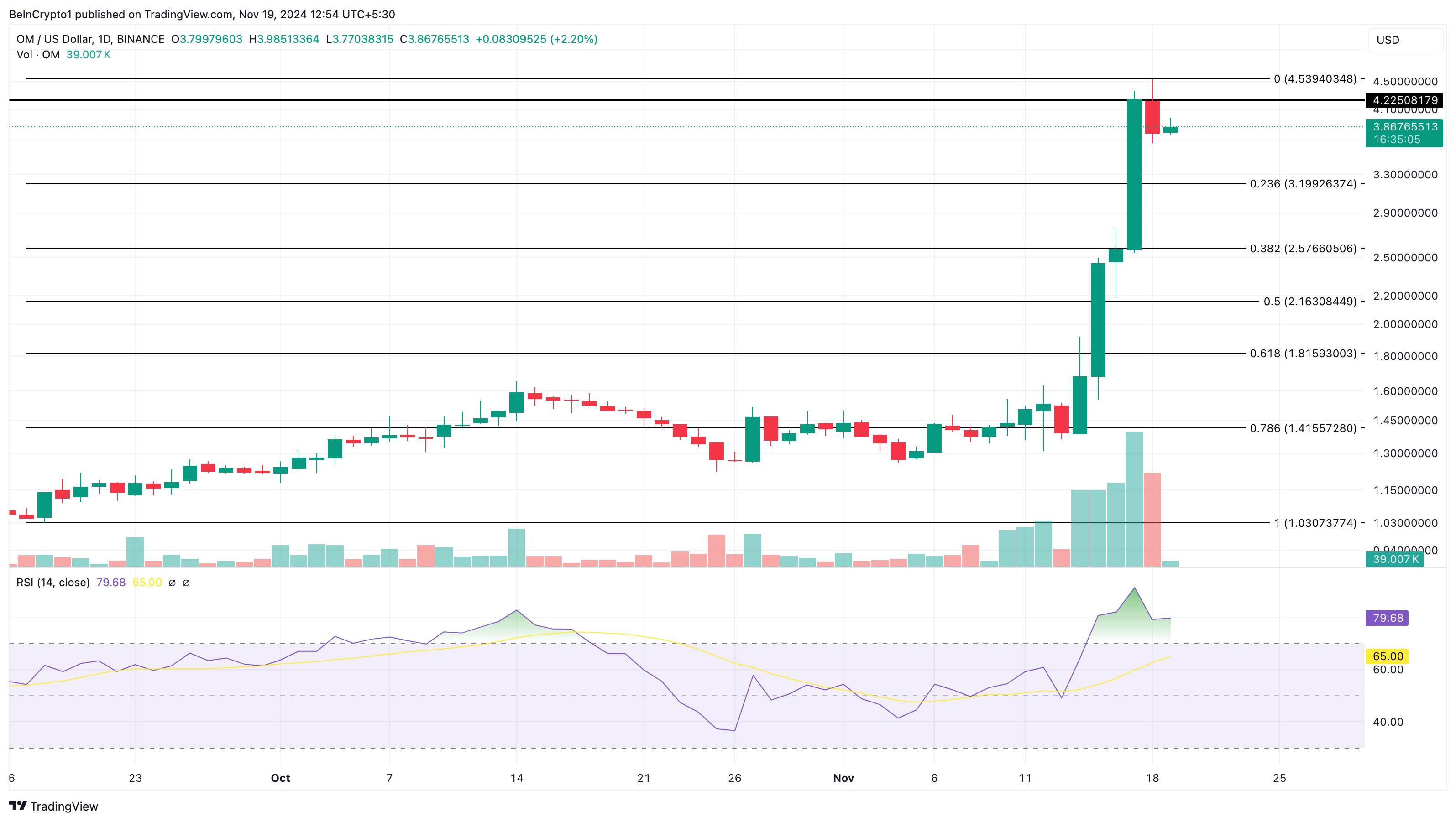 Volgens de dagelijkse grafiek ondervond de OM koers weerstand bij $4,23, wat leidde tot een daling van de waarde van de altcoin naar $3,85. Ook is de Relative Strength Index (RSI) gestegen boven de 70,00 regio, wat aangeeft dat de token overbought is.