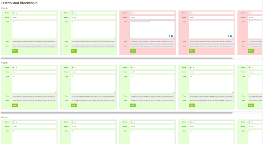 Bitcoin gebruikt de Distributed Ledger-technologie, waarbij de gegevens van transacties gedecentraliseerd en gedistribueerd zijn. De screenshot hieronder laat zien dat terwijl Peer A een ongeldig blok mined, Peer B en Peer C dit kunnen verifiëren. Ze volgen het consensusmechanisme en het ongeldige blok wordt uiteindelijk verworpen.