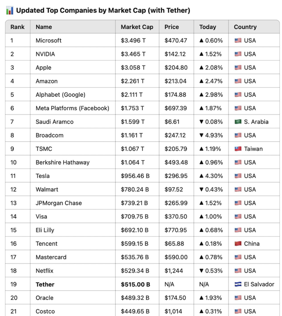 Marktanalyse waardeert de stablecoin-gigant op $515 miljard. Volgens Jon Ma, een ontwikkelaar bij Artemis, is dit genoeg om Tether het 19e meest waardevolle bedrijf ter wereld te maken. Specifiek zou Tether hiermee voor grote namen als Costco en Coca-Cola komen te staan.
