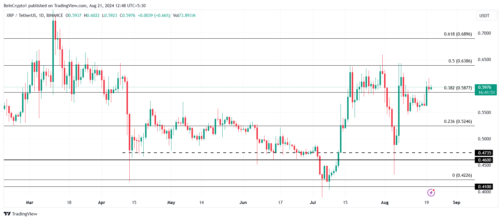 De XRP koers staat op $0,59, net boven het cruciale steunniveau van $0,58, dat samenvalt met de 38,2% Fibonacci retracementlijn. Dit steunniveau heeft de altcoin in het verleden beschermd tegen significante verliezen.