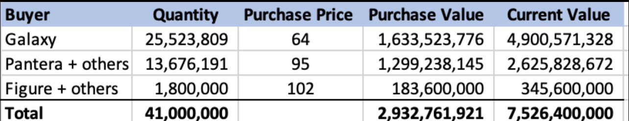 Pantera en andere firma’s deden hun aankopen voor ongeveer $95 per token. Ondertussen verkregen Figure en zijn partners SOL voor $102.