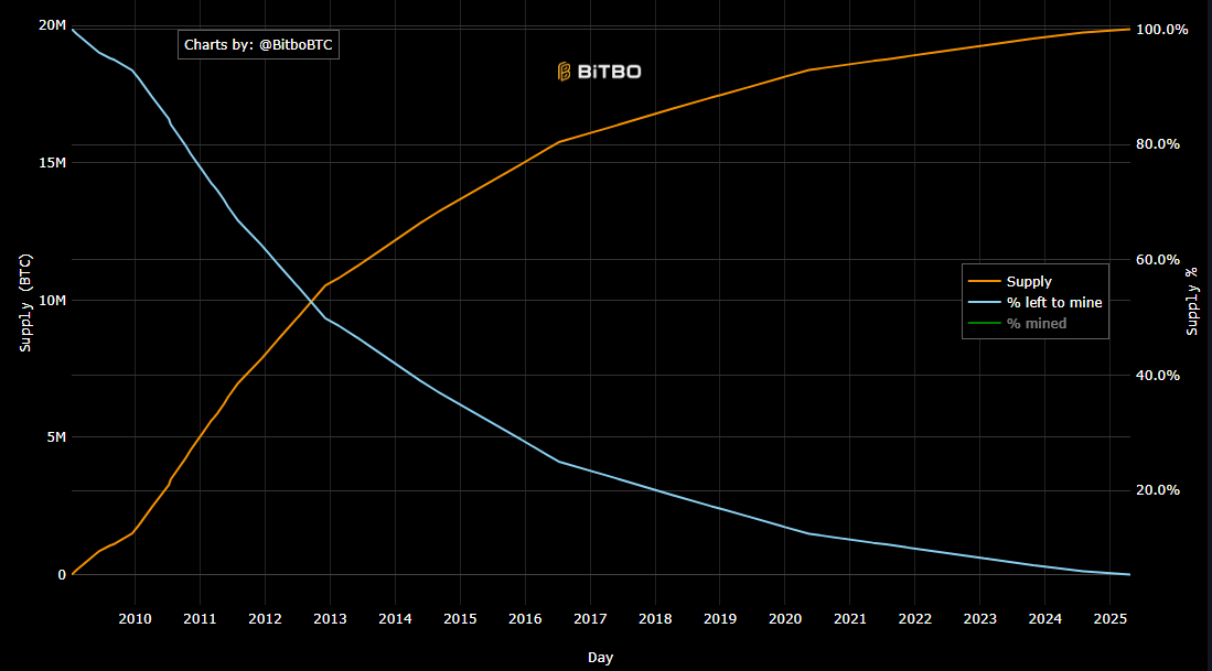 De grafiek illustreert de totale Bitcoin-voorraad (oranje lijn), het percentage Bitcoin nog te minen (blauwe lijn), en het percentage Bitcoin dat al gemined is (groene lijn).
