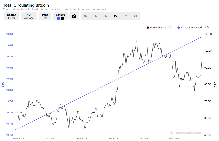 De grafiek toont de totale circulatie van Bitcoin (blauwe lijn) en de marktkoers (zwarte lijn) van het afgelopen jaar.