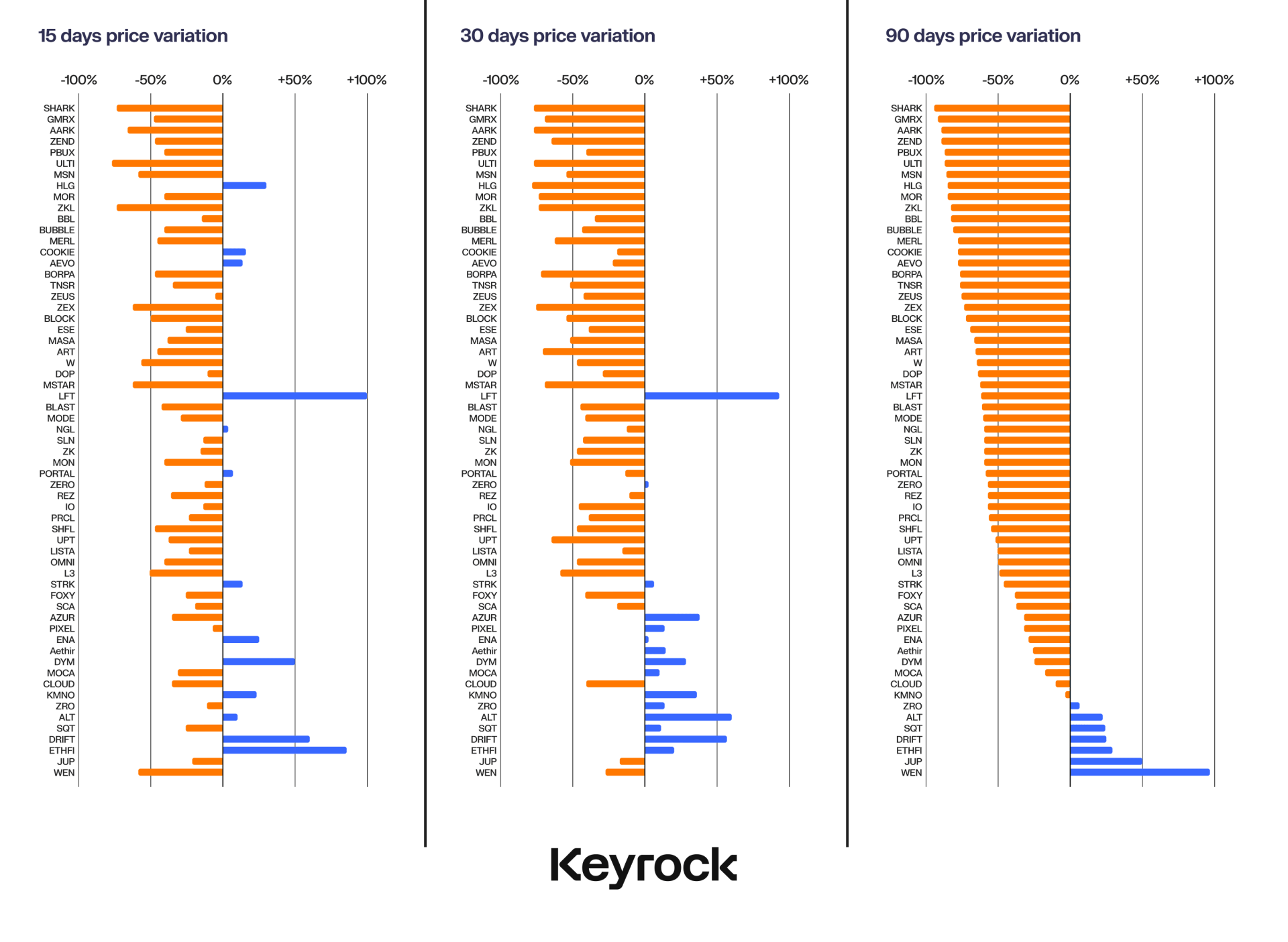 “Als we kijken naar de koersbewegingen over 15, 30 en 90 dagen, wordt het duidelijk dat de meeste prijsbeweging plaatsvindt in de eerste dagen na de airdrop. Na drie maanden slagen maar weinig tokens erin een positief resultaat te behalen, met slechts enkele uitzonderingen,” zei Keyrock hier.