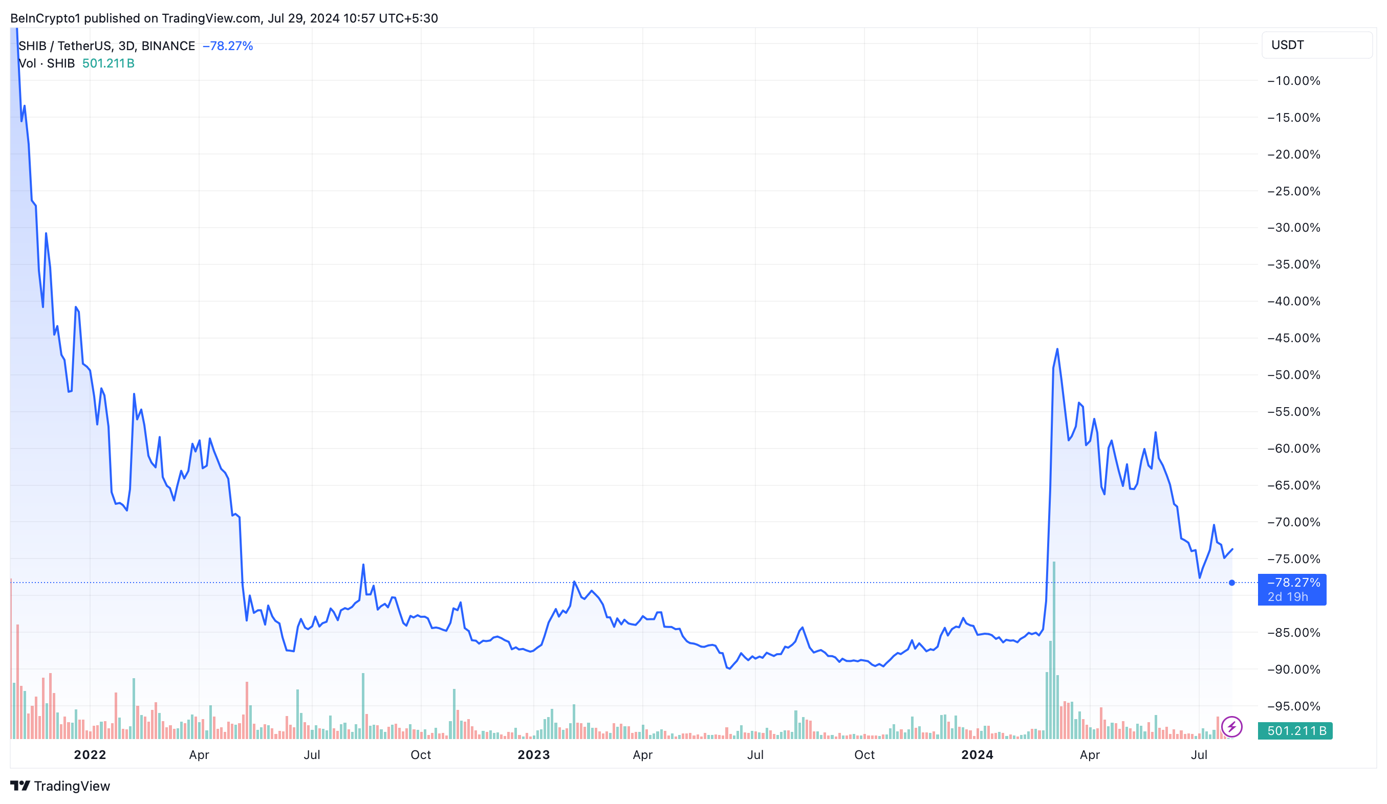 SponsoredYear-to-date is Shiba Inu met 65% gestegen. Nieuwe meme coins zoals Pepe (PEPE), Dogwifhat (WIF) en Bonk (BONK) blijven het echter beter doen dan SHIB.