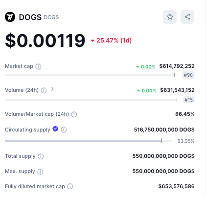 Ondanks de scherpe daling behoudt DOGS een marktkapitalisatie van meer dan $614 miljoen en staat het momenteel in de top 100 cryptomunten op basis van marktkapitalisatie.