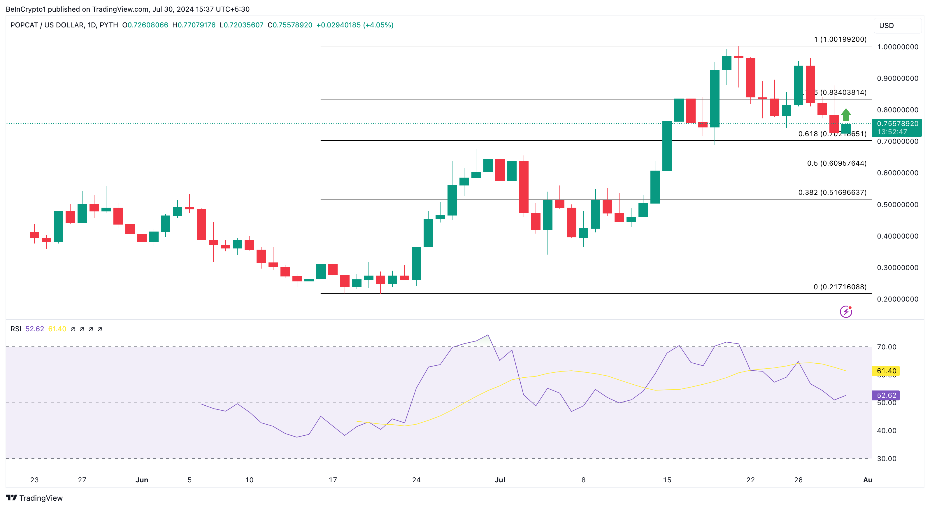 Als dit zo doorgaat, in combinatie met een toename van de koopdruk, kan POPCAT relatief gemakkelijk terugkeren naar $0,83 en vervolgens $1 in augustus. Als tokenhouders echter blijven verkopen, kan deze verwachting niet uitkomen. In dat geval kan de POPCAT koers dalen naar $0,70.